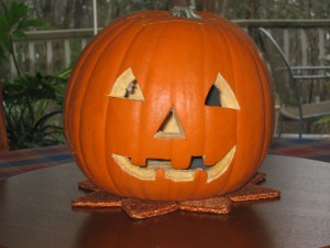 The merchants here do try to make a fuss over it, no doubt hoping to generate a little extra off-budget spending, but I think I may have discovered what some of the problem is. A few days ago I was in the supermarket. Just inside the entry was a large display of very handsome pumpkins, perfectly shaped for jack-o-lanterns. This is a pretty remarkable turn-up, actually. (No, I didn’t say turnip. They don’t have a holiday of their own, as far as I know.) We usually don’t even see this kind of orange pumpkin. So I was naturally attracted to the prospect of having one. They were large; basket-ball size. I found the nicest one and hefted it into my cart (called a trolley here, btw).