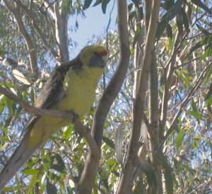 The activity near the house, just beyond the courtyard, is just as hectic: grey fantails, satin flycatchers, various kinds of honeyeaters, and so on. The larger birds are at it as well. “At it” connoting all manner of birdly endeavors. A pair of green rosellas (parrots) were contemplating taking up residence in one of the parrot boxes Nigel and I installed high up in a tree a number of years ago. I think they encountered a sleeping possum as there seemed to be a deal of confusion before they finally left in disgust.