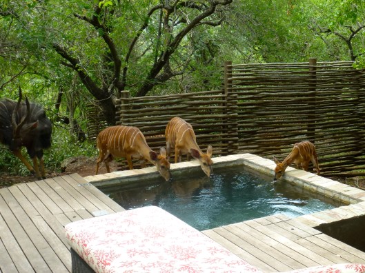 There were two types of antelope in the Phinda Game Reserve: the impala, and the nyala.  The impala and the female nyala are exquisitely graceful and beautiful.  The male nyala is—well—unusual.  And very interesting-looking, with a conspicuous crest down his neck and back and lyre-shaped horns.  He’s dark grey, with bold white spots on his face—on the bridge of his nose—and thin white stripes on his back.  A handsome beast, actually.