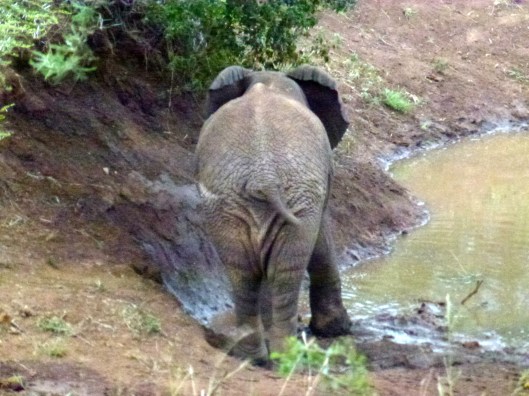 The only elephant we saw was making use of an otherwise deserted watering hole.  S/he was having a fine time making a stand-up mud bath by squirting water onto the steep bank, then rubbing her/himself in the mud.  It was quite a performance.  It was getting very dark, so the photos of it are not very good.