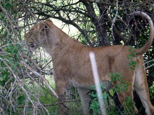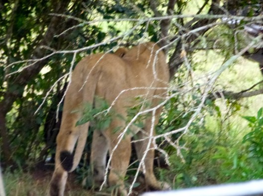 A similar story unfolded the following day when a lioness and her two cubs feasted on a wildebeest.  It didn’t seem to be such a fresh kill, and by the time we arrived the cubs had taken off to pester a herd of wildebeest (having just eaten, they were no doubt just ‘practicing’).  The lioness spent a lot of time trying to pull the wildebeest further into the bushes so as not to be visible to vultures.  She tugged and pulled, to no avail, until she finally worked out that she would have better luck from another angle.  The deed was eventually done, and she settled down to feast.  Like the cheetah, she took no interest in our presence.