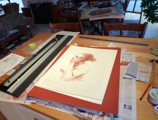 Now on to the other reason I’m sore. Sore as in annoyed, cranky, irritated, grumpy, disgusted, and thoroughly pissed off. My kitchen and dining room area has been like a bomb site for several days. I’m in the throes of doing some major picture-framing jobs. Lots of framing–repairing and making new frames. I love it, but I’m getting tired of the mess.