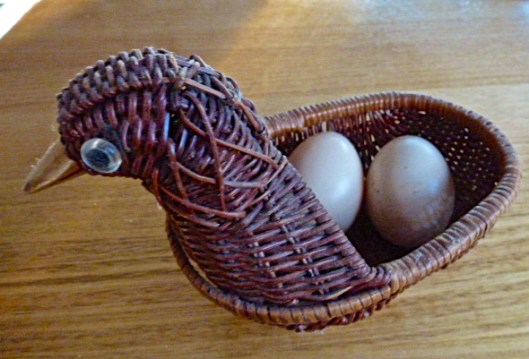 Just a quick note today, folks, to let you know that I Have Eggs–two lovely little googies, in fact. I have no idea whence they came–that is, I don’t know who layed them. It could simply be a resumption of duties by Blossom, dearie, but they are everso slightly different from each other, so I suspect a second chook has got in on the act We shall see. Re the differences: the colour is lightly different, as is the shape. And one is 51g and the other only 46g. I’m thinking that a hen doesn’t usually lay different colored eggs, or, indeed, different shapes. So we might have a Copy Cat Layer who is following the lead of Blossom, dearie. Who knows–maybe that’s what Ella’s been crowing about!